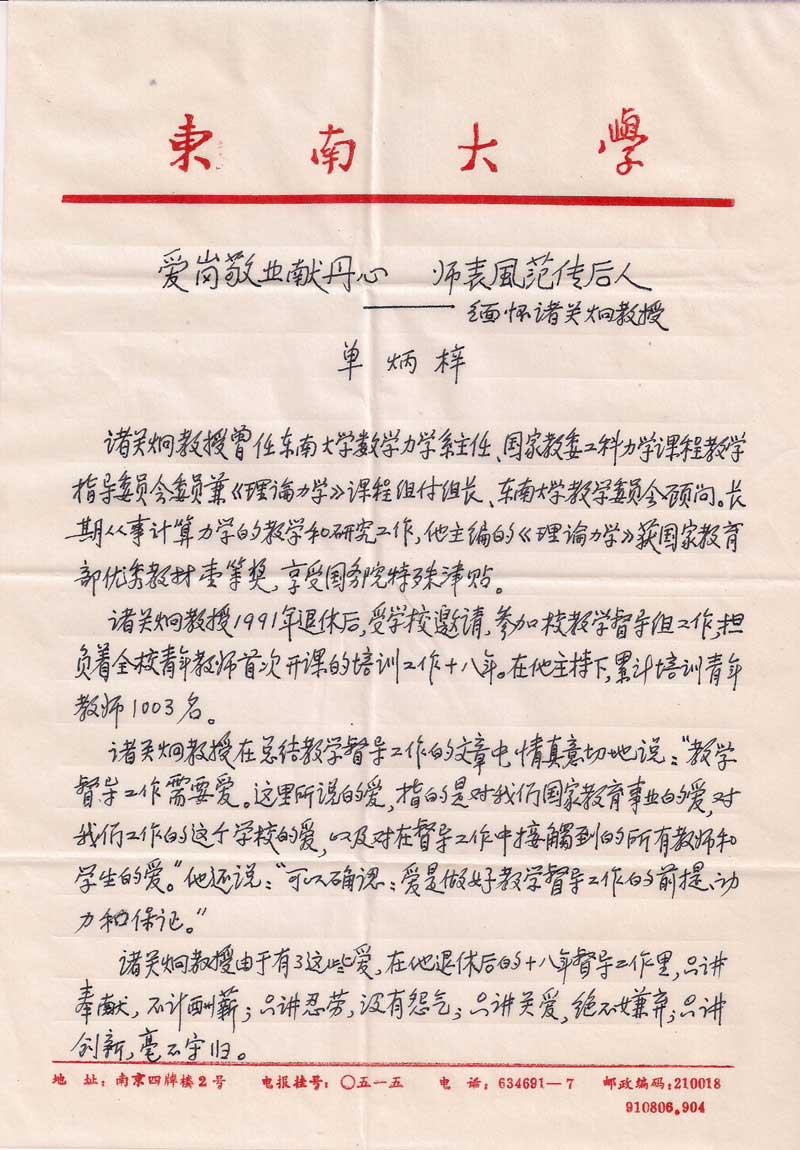 编者按:诸关炯教授在患病住院6个月后于2013年11月21日早晨与世长辞,享年82岁。第一时间闻此噩耗的单炳梓教授深感悲痛,挥笔写下了这篇怀念文章。 诸老师和单老师退休后同被聘为校教学督导组专家,共同在教学督导组工作了18年。对学校、对学尤其对青年教师共同的爱,使他们结下了深厚的友谊。在诸老师住院期间,到医院探视次数最多的老同事就是单老师。尽管对诸老师的病情很了解,但当闻此噩耗,单老师还是非常悲痛,所以,挥笔写下了这篇思念的文章。 诸老师在健康时就与老伴约定百年之后不出讣告、不设灵堂、不开举行官方的告别式,所以,单老师挥笔写下了这篇纪念文章。 现将单炳梓教授的这篇短文贴于此,借此表达我们对诸关炯教授沉沉的怀念和深深的敬意。 |