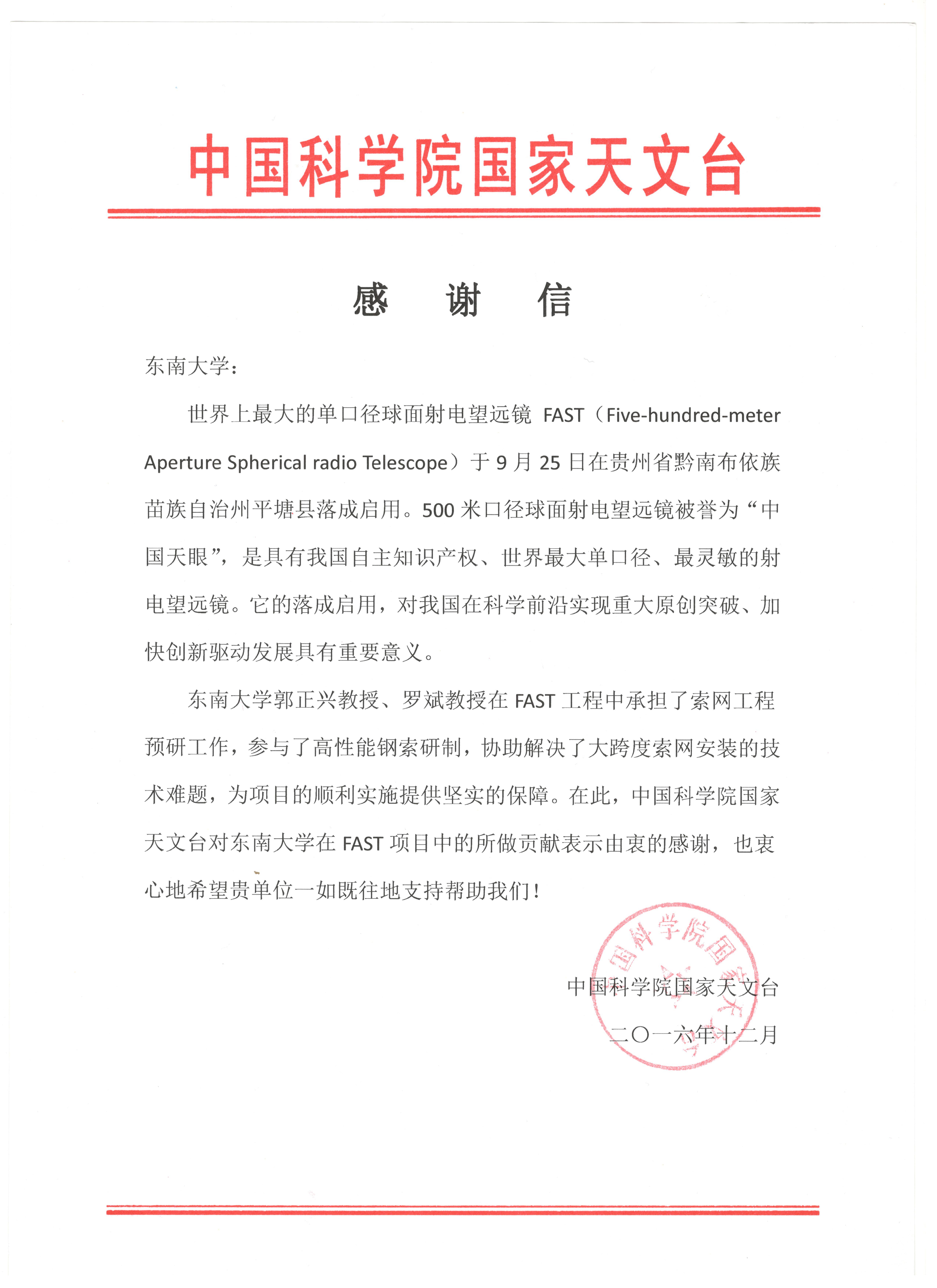 近日,中国科学院国家天文台特别致信我校,对我校在FAST项目中的所做贡献表示由衷的感谢,并衷心期待新葡的京集团35222vip一如既往的支持和帮助。