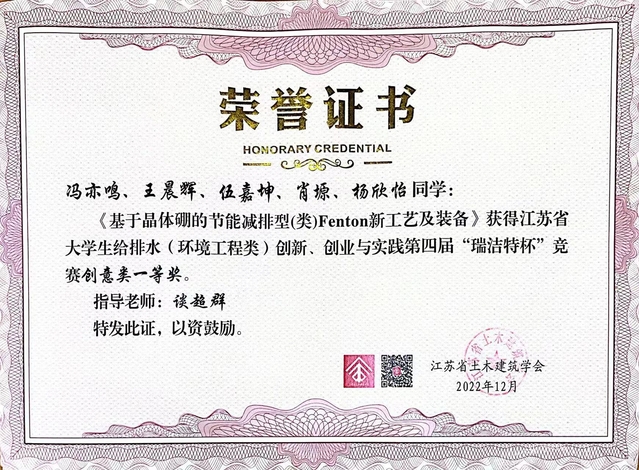 本届竞赛我校由谈超群老师组织了15组队伍代表新葡的京集团35222vip参赛(本科生4组,研究生11组),新葡的京官网市政工程系学子共获一等奖3项、二等奖2项、三等奖3项(表1)。其中20级本科生冯亦鸣等的作品《基于晶体硼的节能减排型(类)Fenton新工艺及装备》荣获本科生创意类一等奖;20级研究生黄婷婷等的作品《Effects of bromide ion on the formation and toxicity alteration of halonitromethanes from nitrate containing humic acid water during UV/chlor(am)ine disinfection》和22级博士生王涛等的作品《Formation of brominated halonitromethanes from threonine involving bromide ion during the UV/chlorine disinfection》也荣获了研究生论文类一等奖。