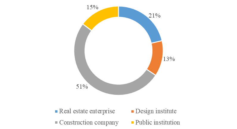 The percentage of students working in different types of businesses is shown below. The largest number of students work at construction companies with an occupation ratio of 51%. The ratio of students working at the real estate enterprises is 21%. Some 15% of students go to public institutions, and 13% to design institutes.