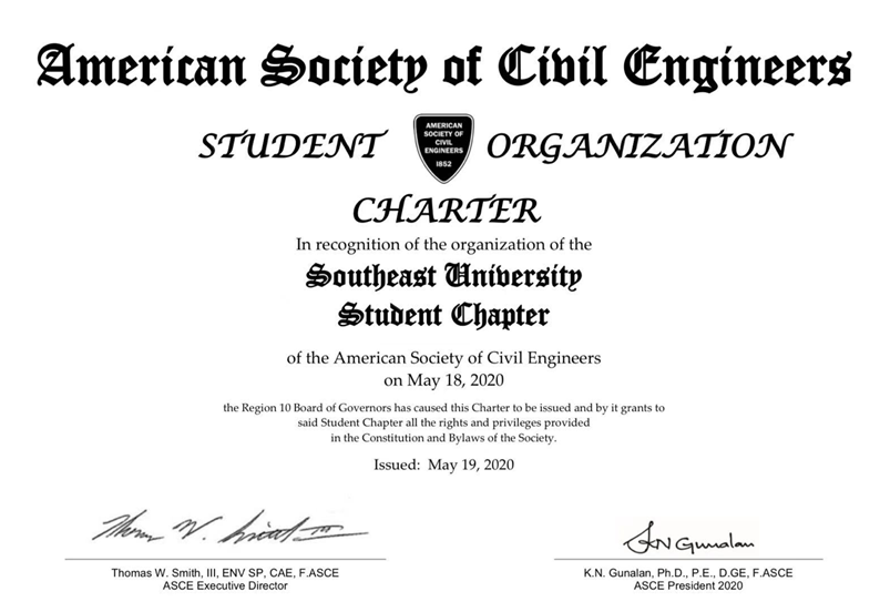 Founded in 1852, the American Society of Civil Engineers (ASCE) is America's oldest national engineering society. It represents more than 133,000 members of the civil engineering profession worldwide. Southeast University Student Chapter of the American Society of Civil Engineers (ASCE-ISG-SEU) was approved to become a full member of the American Society of Civil Engineers (ASCE) on May 19, 2020. ASCE-ISG-SEU was established in 2015 with the help of Prof. Jingquan Wang and Prof. Zhongguo John Ma from the University of Tennessee, and has been invited by the University of Tennessee, University of California at Berkeley, University of Memphis, University of Louisiana at Lafayette, University of Central Florida and other universities and organizers to participate in the ASCE Student Conferences. (ASCE Student Conferences).