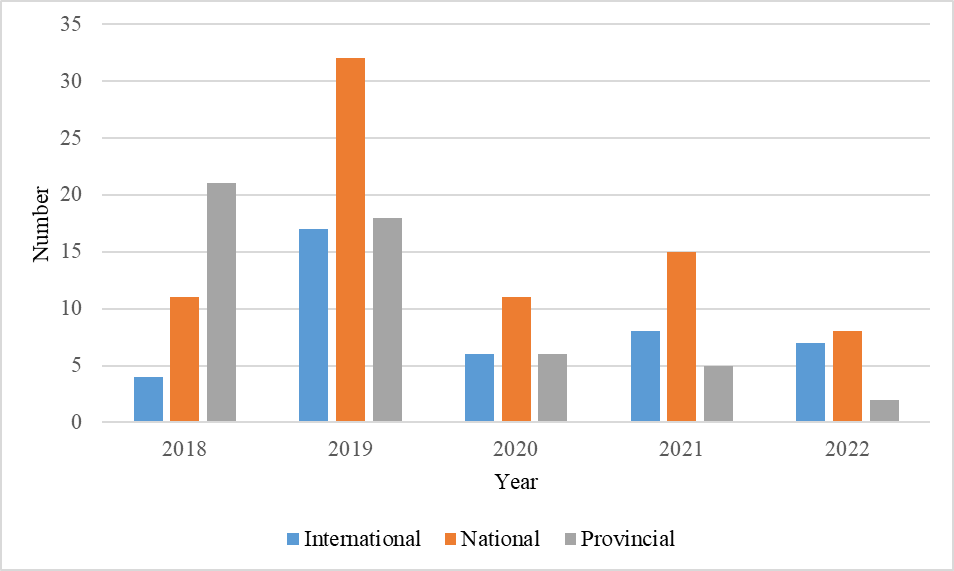 The number of awards achieved from 2018 to 2022. Example of an international award achieved is the 2022 ASCE Sustainable Solutions Competition where SCE students won second place. Example of a national award achieved is the 2019 National Structural Design contest, which involved more than 100 universities, where SCE students were the meritorious winners. For provincial awards, the total number of awards achieved from 2018 to 2022 has reached 52.