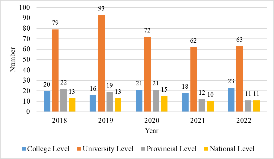 University-level projects occupied the largest proportion each year, which represents the average condition of SRTP projects in SCE. School-level projects are less than the university-level projects. The number of national-level projects is around 12 in each of the past five years, while the number of provincial-level projects fluctuates around 15.
