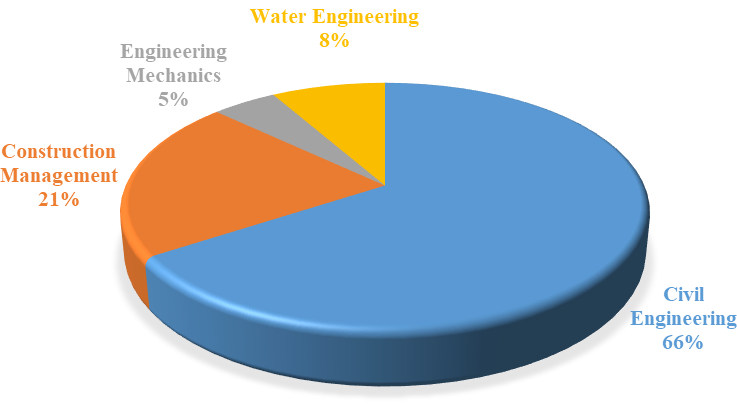 The ratios for Civil Engineering, Construction Engineering, Engineering Mechanics, and Water Engineering are 66%, 21%, 5%, and 8%, respectively. These ratios are consistent with the number of students in each major.
